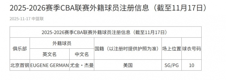 11月17日訊 CBA官方更新《2025-2026賽季CBA聯(lián)賽外籍球員注冊(cè)信息》。