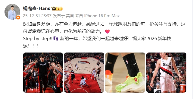 12月31日訊 開拓者球員楊瀚森在2026年來臨之際,更新微博動態(tài)。