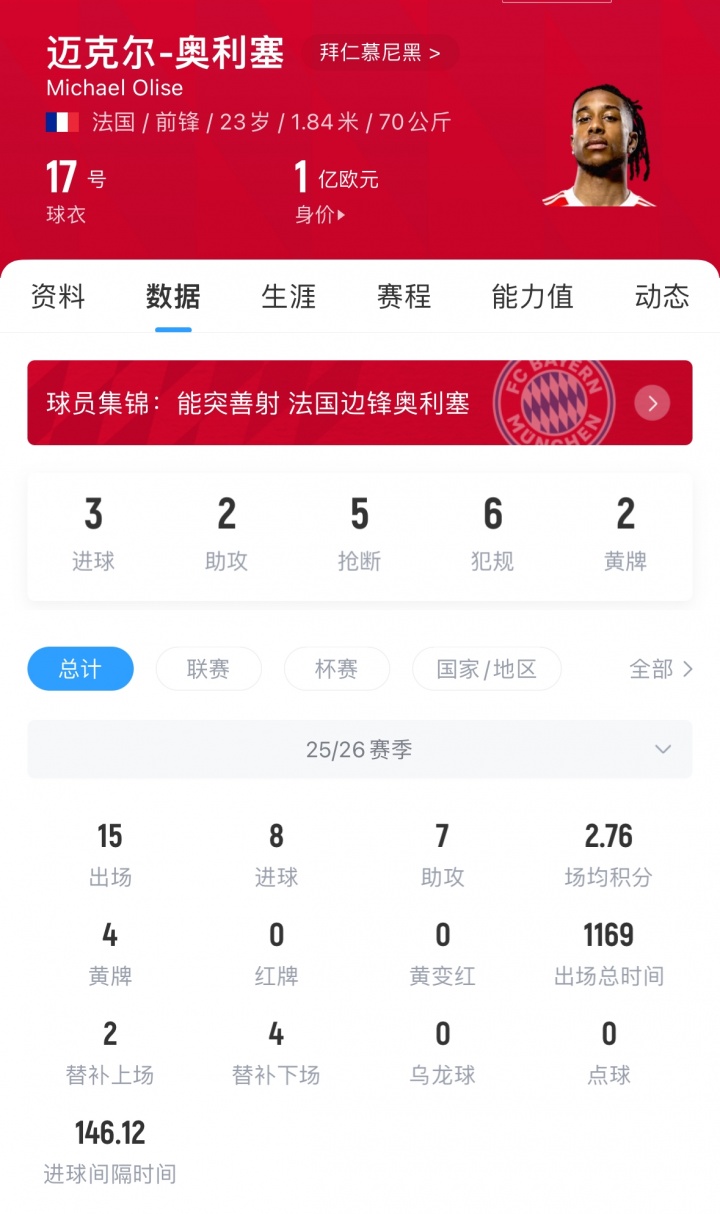 奧利塞現(xiàn)年23歲,司職右邊鋒,他本賽季為拜仁出戰(zhàn)15次,貢獻(xiàn)8球7助,他與拜仁的合同在2029年到期,現(xiàn)身價(jià)1億歐。