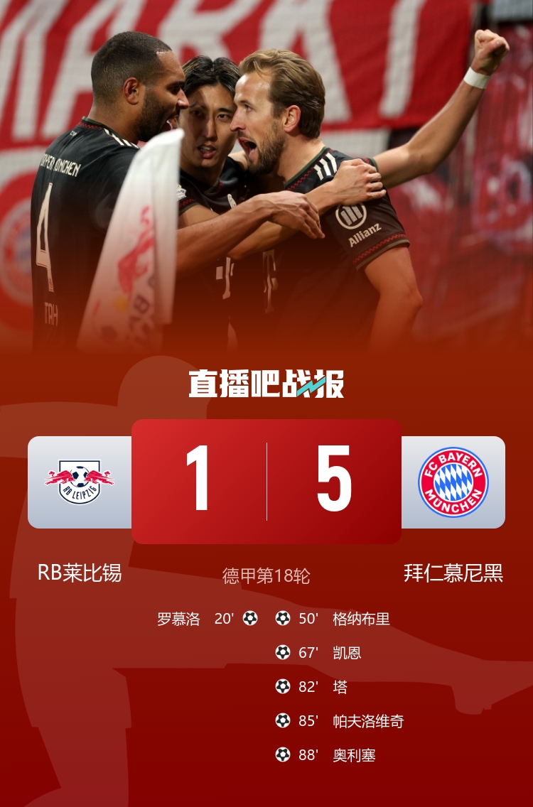 1月18日訊 德甲第18輪,RB萊比錫坐鎮(zhèn)主場(chǎng)萊比錫紅牛競(jìng)技場(chǎng)迎戰(zhàn)拜仁慕尼黑。上半場(chǎng),羅慕洛先拔頭籌,努薩錯(cuò)失良機(jī)。易邊再戰(zhàn),格納布里、凱恩破門,迪奧曼德失單刀,塔、帕夫洛維奇、奧利塞連進(jìn)三球,穆西亞拉復(fù)出送助攻。最終拜仁5-1萊比錫。積分榜方面,拜仁50分以11分優(yōu)勢(shì)領(lǐng)跑,萊比錫32分第四。