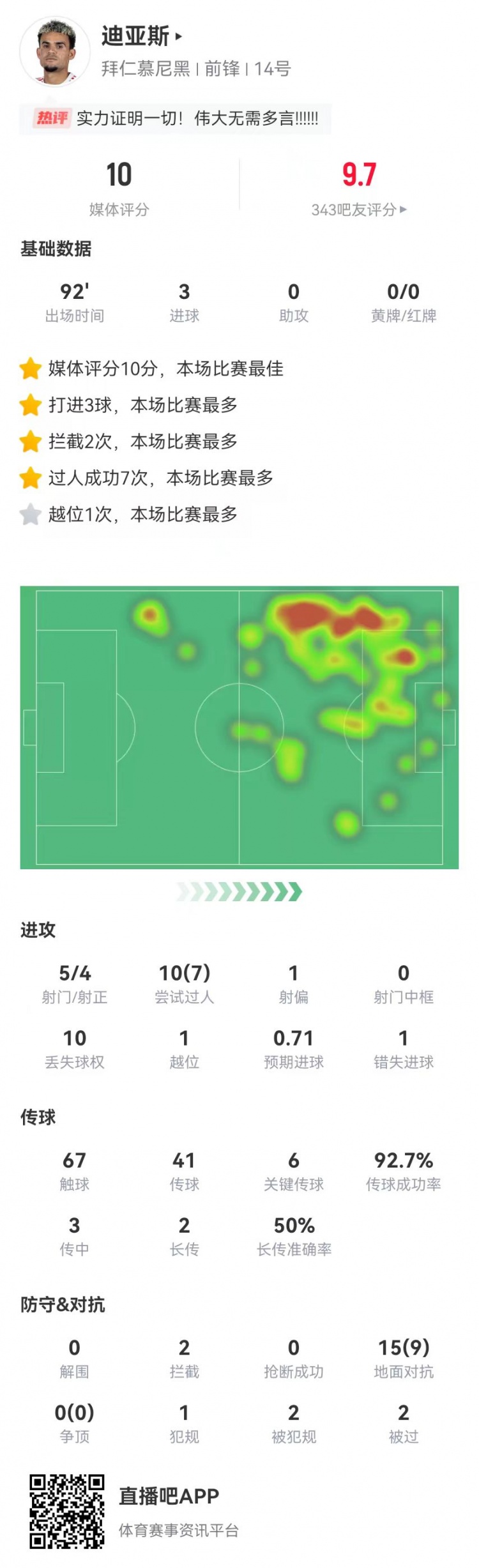 2月9日訊 拜仁在本輪德甲5-1大勝霍芬海姆,迪亞斯本場(chǎng)數(shù)據(jù)如下:
