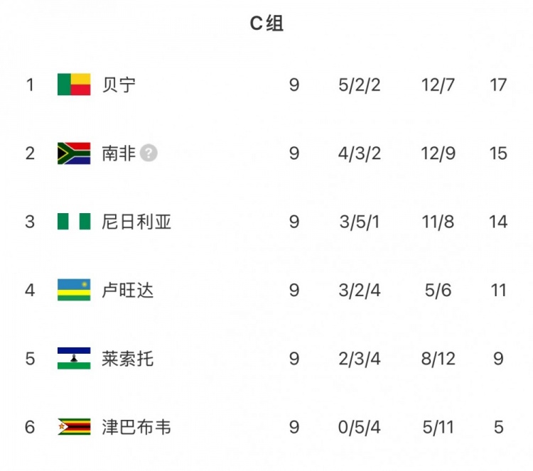 9輪過(guò)后,貝寧以17分領(lǐng)跑C組,領(lǐng)先第二名南非2分,第三尼日利亞3分。