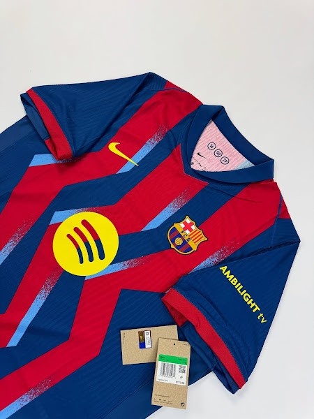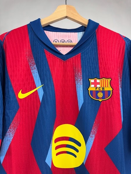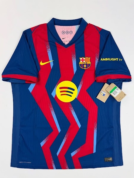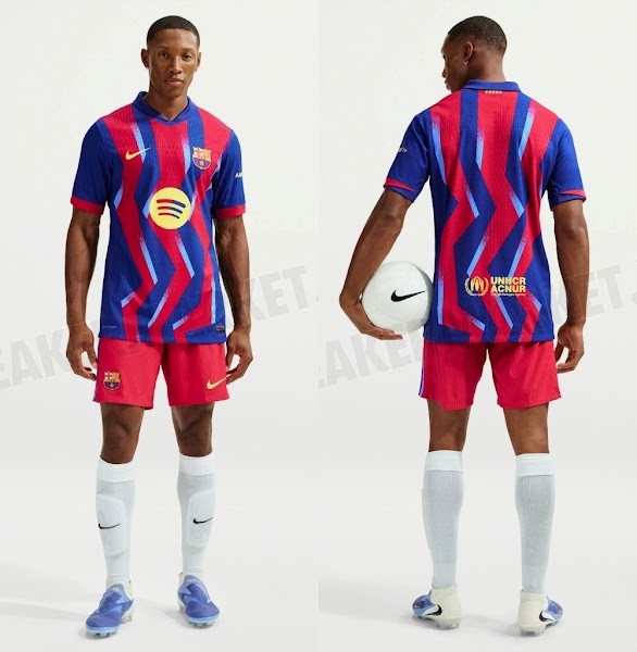 與20年前的經(jīng)典藍紅條紋不同,巴塞羅那2025-26賽季第四球衣采用了藍色和紅色的鋸齒形條紋,并帶有淺藍色的圖形元素。