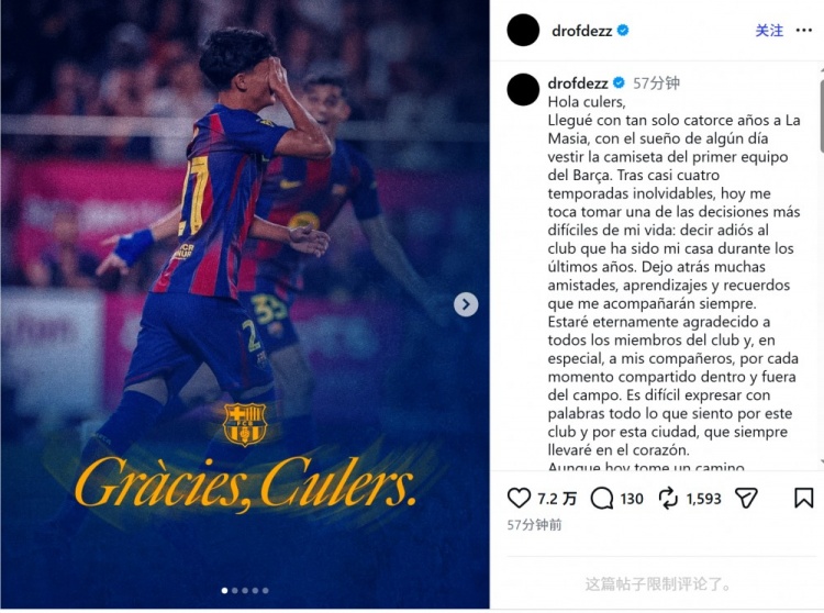 盡管今天我選擇踏上另一條道路,但無(wú)論身在何處,我都會(huì)像一名普通球迷一樣繼續(xù)支持你們,為你們加油。巴薩和拉瑪西亞不僅是我成長(zhǎng)道路上的重要部分,更將永存在我的生命之中。感謝你們所做的一切。
