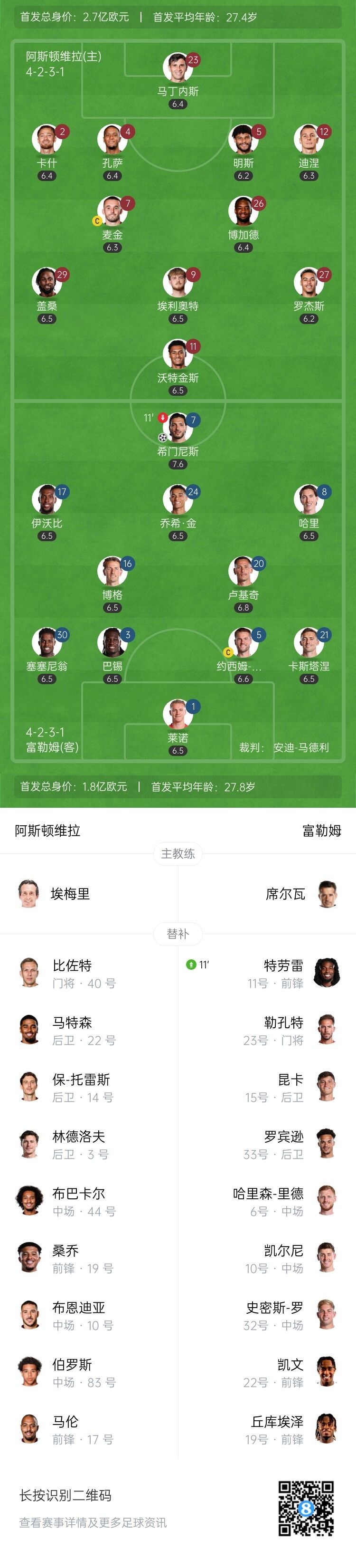 9月28日訊 北京時(shí)間9月28日晚上21:00,英超第6輪,阿斯頓維拉坐鎮(zhèn)維拉公園球場(chǎng)迎戰(zhàn)富勒姆。上半場(chǎng),希門(mén)尼斯3分鐘破門(mén),明斯傷退,馬丁內(nèi)斯化解單刀,沃特金斯挑射扳平。半場(chǎng)戰(zhàn)罷,阿斯頓維拉1-1富勒姆。