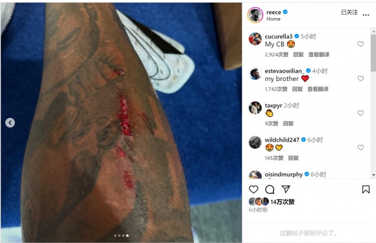 里斯-詹姆斯賽后更新社媒動態(tài),曬出比賽照片,以及腿上的傷口。