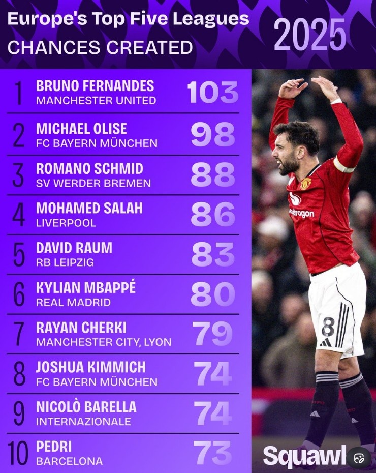 12月31日訊 數(shù)據(jù)網(wǎng)站Squawka盤點(diǎn)了2025年五大聯(lián)賽創(chuàng)造機(jī)會榜,其中B費(fèi)居首,具體如下: