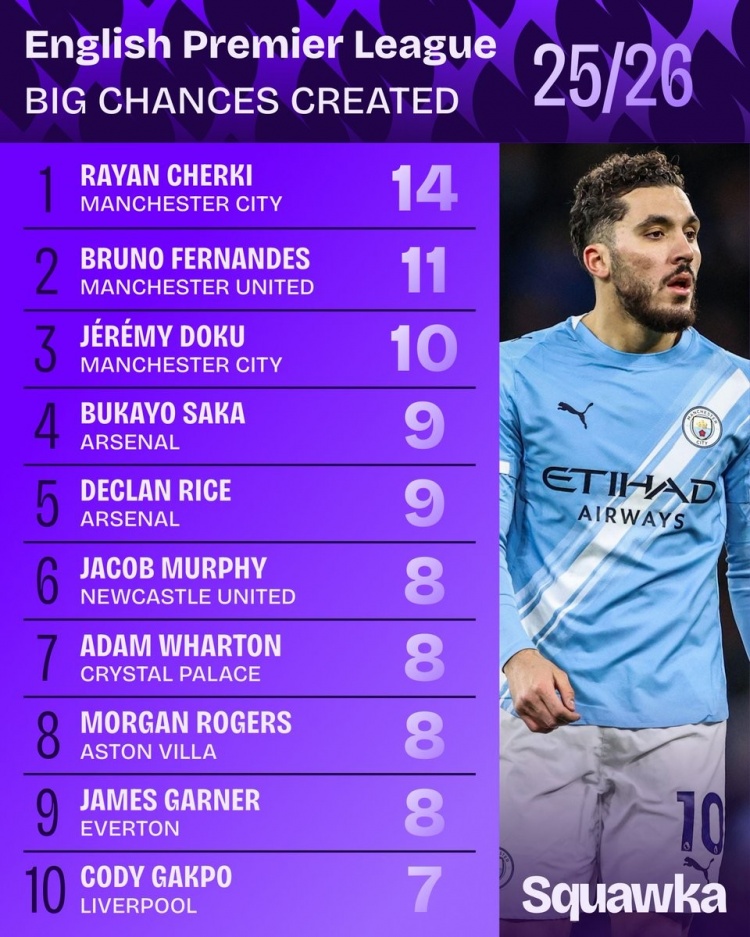 本賽季英超創(chuàng)造重大機(jī)會(huì)榜: