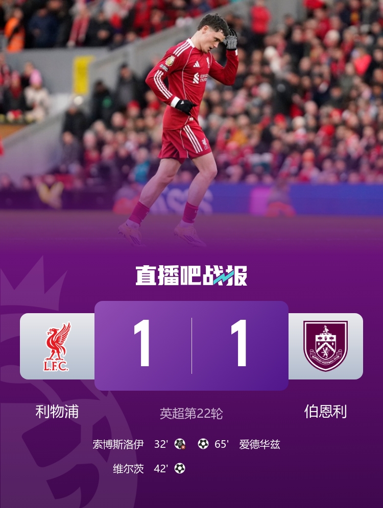 1月18日訊 北京時間1月17日23點(diǎn),英超第22輪,利物浦在主場安菲爾德球場迎戰(zhàn)伯恩利。上半場,加克波造點(diǎn),索博點(diǎn)射中框,維爾茨打破僵局。下半場,加克波絕佳機(jī)會被漢弗萊斯門線解圍,愛德華茲扳平比分,此后利物浦多次制造威脅但都未能破門。最終利物浦1-1伯恩利。本場比賽過后,利物浦積36分重新回到聯(lián)賽第四的位置,伯恩利積14分排在聯(lián)賽倒數(shù)第三。