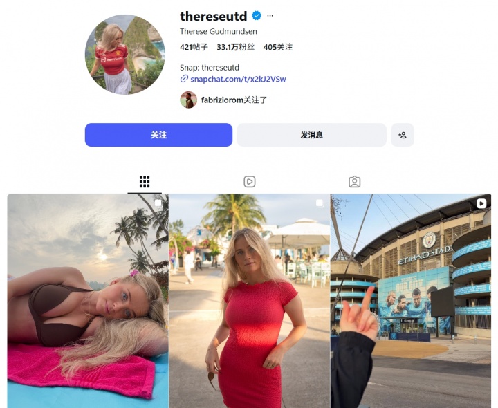02月10日訊 據(jù)太陽報報道,一名叫Therese Gudmundsen的曼聯(lián)網(wǎng)紅女球迷最近更新社媒曬出自己的美照,引發(fā)了不少球迷的驚嘆。