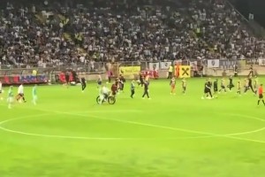 由于腳踝受傷,奧地利主帥朗尼克騎電動車回更衣室